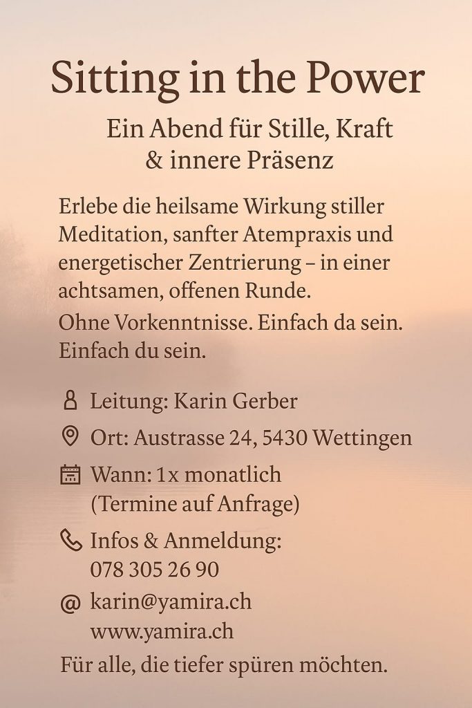 Sitting in the Power ist eine stille, meditative Praxis, in der Du Dich mit Deiner inneren Kraft und Deinem energetischen Raum verbindest. Es geht nicht ums Tun, sondern ums Sein und darum, in Deiner eigenen Energie zu verweilen. Diese liebevoll wahrzunehmen, auszudehnen und zu stärken.